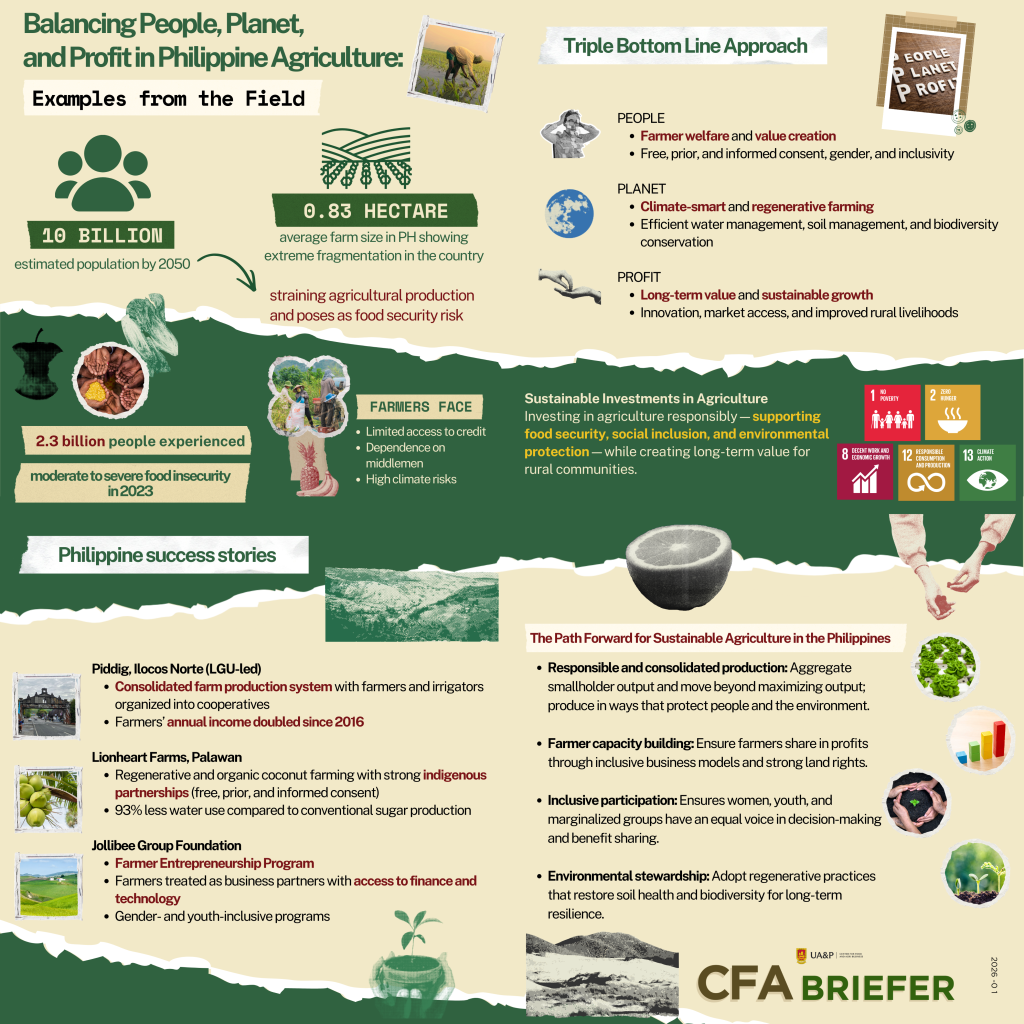 This article positions sustainable investment in Philippine agriculture as a critical response to food insecurity and resource pressure. Centering on the Triple Bottom Line, it highlights how organizations can prioritize social equity and environmental protection while remaining economically viable. Through case studies, the article demonstrates sustainable growth that replaces mere output maximization with responsible value.