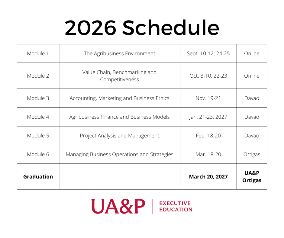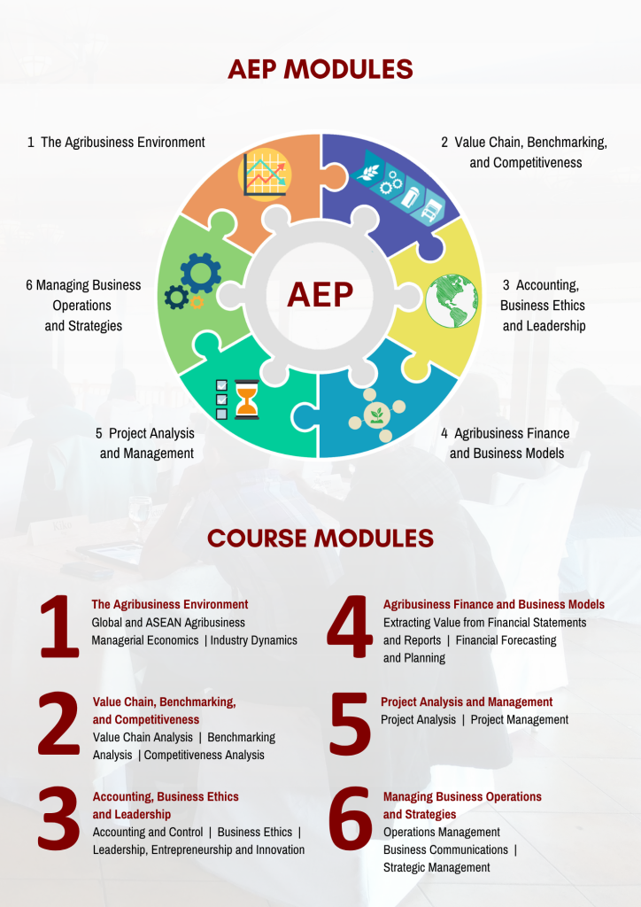 The Agribusiness Executives’ Program (AEP) is a six-month certificate program designed to strengthen the managerial, analytical, and strategic thinking skills of executives and managers in the food and agribusiness sector.